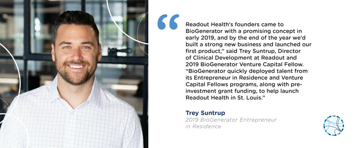 “Readout Health’s founders came to BioGenerator with a promising concept in early 2019, and by the end of the year we’d built a strong new business and launched our first product,” said Trey Suntrup, Director of Clinical Development at Readout and 2019 BioGenerator Venture Capital Fellow. “BioGenerator quickly deployed talent from its Entrepreneur in Residence and Venture Capital Fellows programs, along with pre-investment grant funding, to help launch Readout Health in St. Louis.”