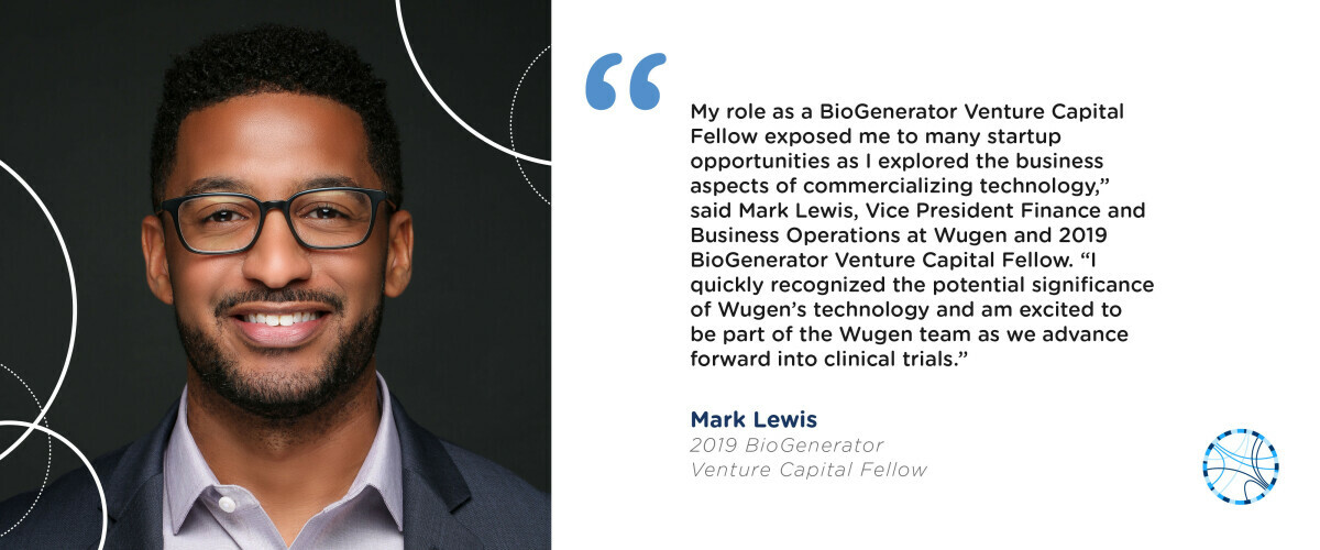 “My role as a BioGenerator Venture Capital Fellow exposed me to many startup opportunities as I explored the business aspects of commercializing technology,” said Mark Lewis, Vice President Finance and Business Operations at Wugen and 2019 BioGenerator Venture Capital Fellow. “I quickly recognized the potential significance of Wugen’s technology and am excited to be part of the Wugen team as we advance forward into clinical trials.”