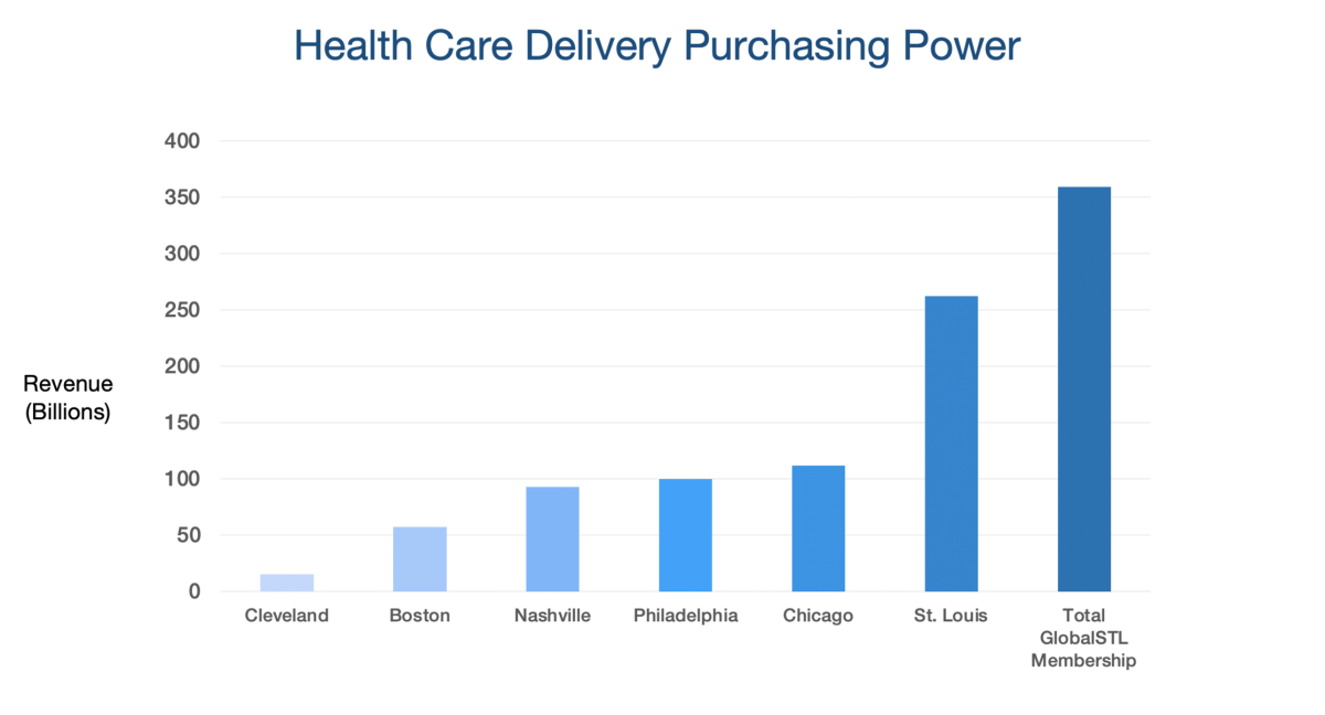 St. Louis is a fantastic ecosystem for startups to accelerate or enter the US market with many large health care companies headquartered here. A little-known fact is that St. Louis has more health care delivery purchasing power than Boston, Cleveland, Philadelphia, Nashville, and Chicago. We define health care delivery as providers, payers, PBMs, and health services companies.