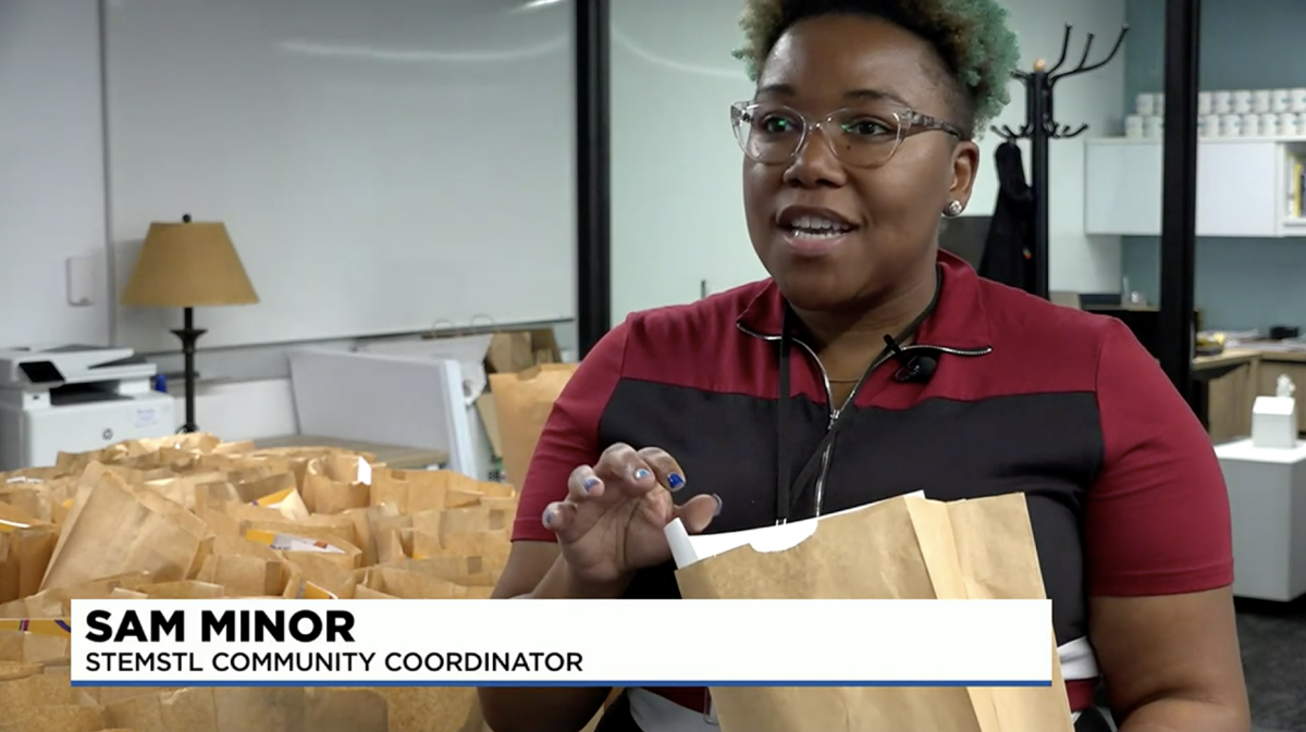 Sam Minor, the community coordinator for STEM STL, said, “We have instructions for like rain clouds in a jar, some wonderful coloring sheets. These aren’t your typical coloring sheets, you have to solve math problems to complete them. Lowes, they donated some seed growing kits.”